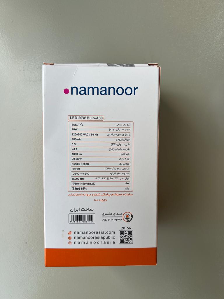 لامپ حبابی 20 وات نما نور با رنگ آفتابی و مهتابی و صدفی در ابعاد 80*80*140 تولید و عرضه شده است.